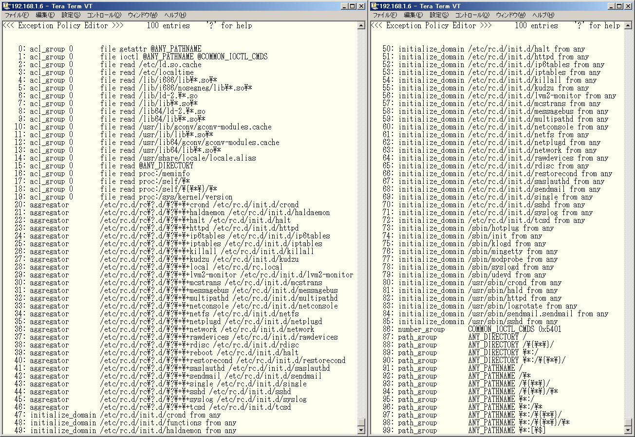 Now run the policy editor again without the "/etc/tomoyo/" option in order to view the policy that is loaded in the kernel: