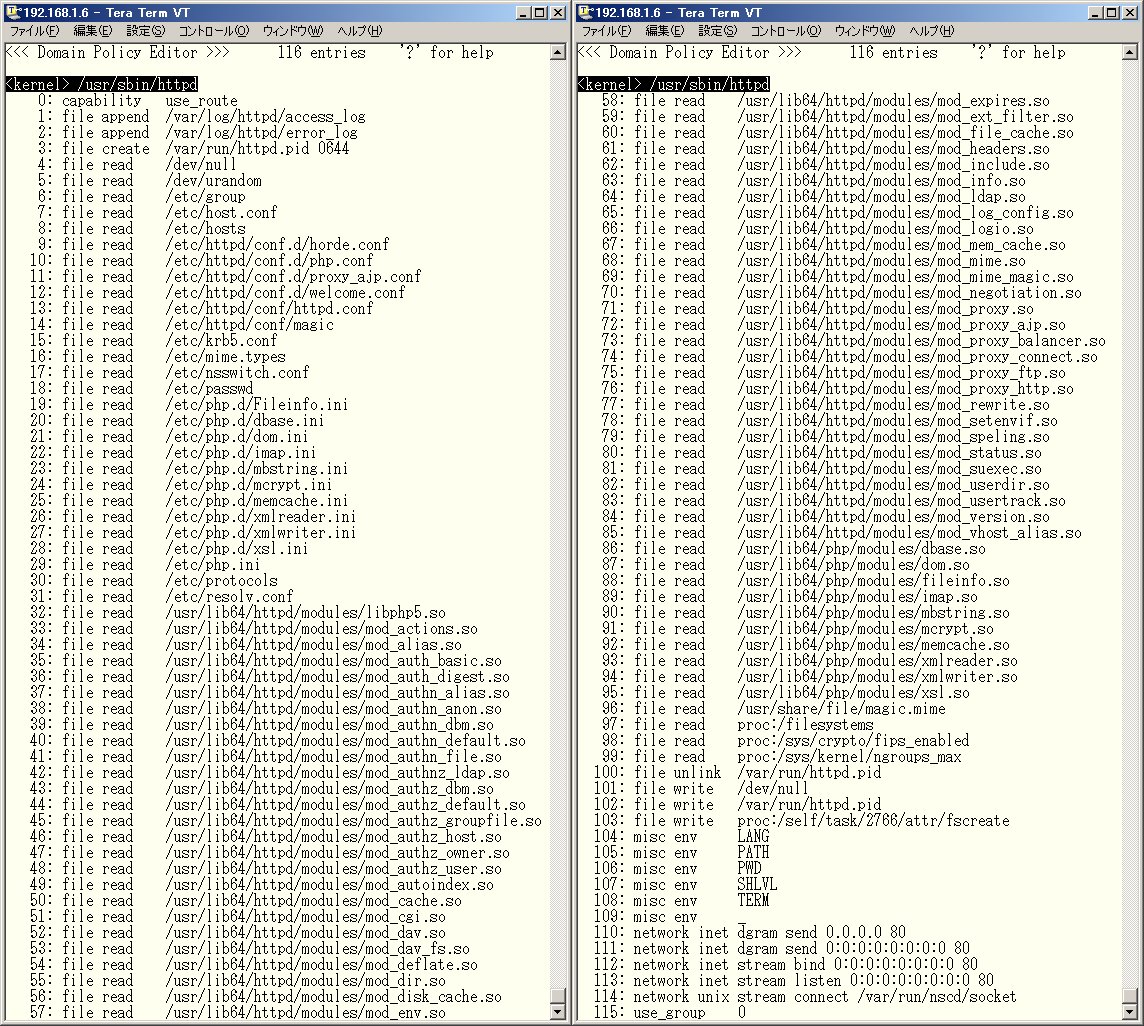 The restrictions of each domain can be viewed using the "Domain Policy Editor" screen, which can be accessed by selecting a domain in the "Domain Transition Editor" screen, and then pressing the "Enter" key. Since no policy has been developed yet, the screen is empty. This is an example of domain policy for Apache: